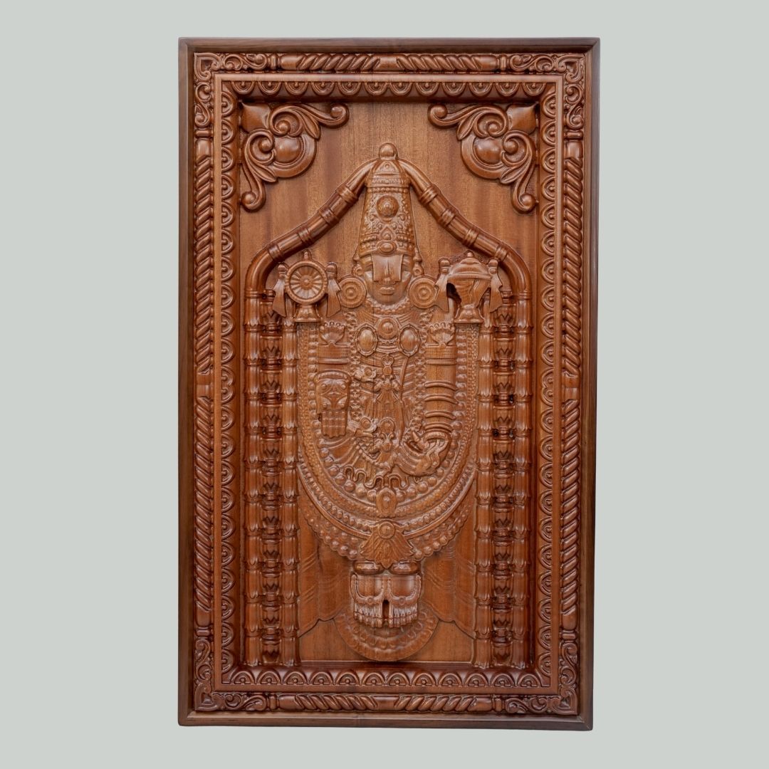 The detailed carving beautifully captures the majestic and serene form of Lord Venkateswara (Tirupati Balaji), revered as the granter of wealth, peace, and well-being. The natural grains and warm tones of teakwood enhance the depth of the carving, making each piece truly unique.
